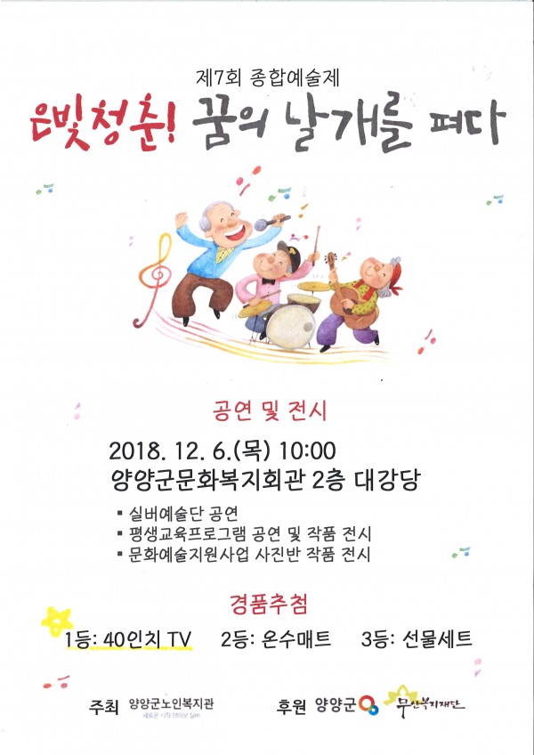 제7회 종합예술제 "은빛청춘! 꿈의 날개를 펴다" 페이지 정보 작성자 작성일18-12-04 11:03 조회536회 관련링크 이전글 다음글 목록 본문 많은 관심과 참여 부탁드립니다. 이전글 다음글 목록