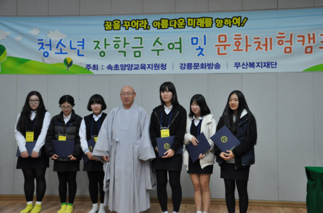 사회복지법인 대한불교조계종 무산복지재단(이사장 정념스님)은 2014년 11월 21일(금요일) 양양관내 초등학생 20명, 중학생 25명, 고등학생 25명으로 총 70명에게 장학금 2,200만원을 전달하였습니다.