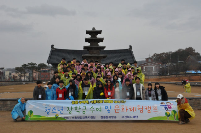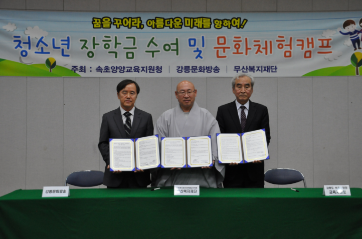 무산복지재단이 속초양양교육지원청과 강릉MBC와의 업무협약을 통하여 2009년부터 시작한 장학금 지원사업은 어려운 가정형편에서도 학업에 매진하는 청소년들에게 학업의지에 대한 안정적 지원과 환경을 제공함으로써 미래에 대한 희망을 갖고 지역사회의 일원으로 성장하게 하는데 목적을 두고 있습니다.