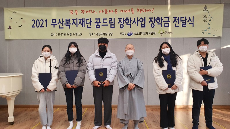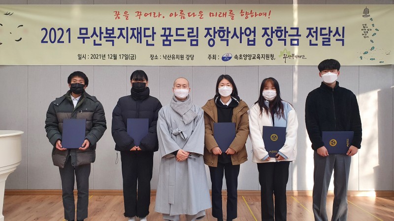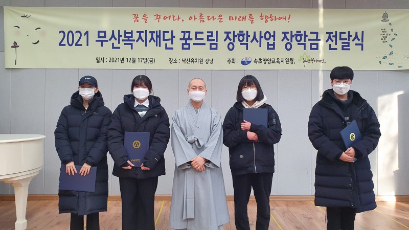 2021년 꿈드림 장학사업 장학금 전달식 페이지 정보 작성자 최고관리자 댓글 0건 조회 310회 작성일 21-12-17 17:00 본문 사회복지법인 대한불교조계종 무산복지재단(대표이사 수미스님)은 2021년 12월 17일 장학금 전달식을 가졌습니다. 목록 이전글5월 5일 어린이날 낙산사 싱잉볼 명상 체험 22.05.06 다음글2021년 따뜻한 겨울나기 사업 21.12.14 댓글목록 댓글목록 등록된 댓글이 없습니다.